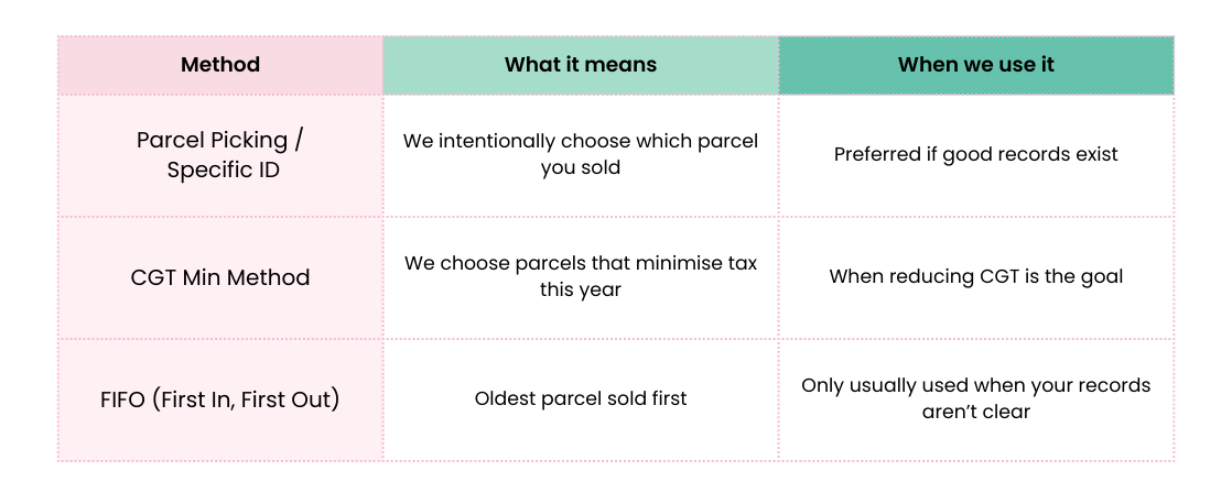 But it’s not always about minimising tax immediately - sometimes it’s smarter to trigger more gains now (e.g. when you’ve got carried-forward losses you want to use). Parcel picking lets us play the long game.