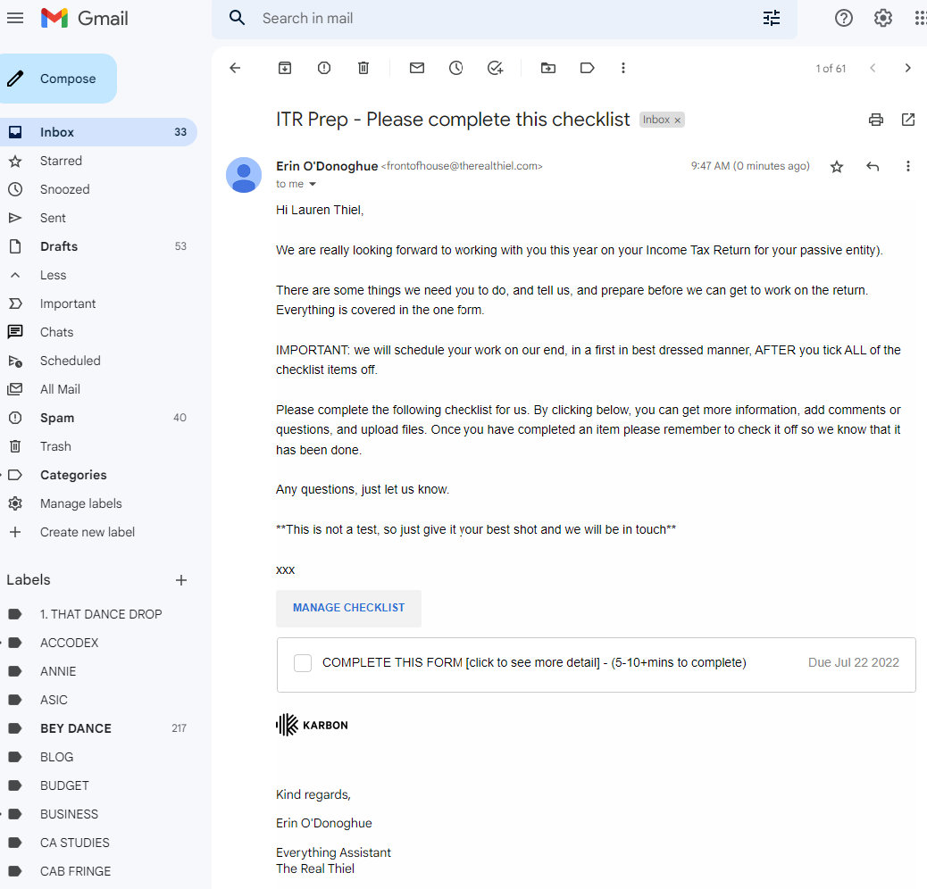 You will receive an email with your tasks. Click on ‘manage checklist’ to access the tasks you need to complete.